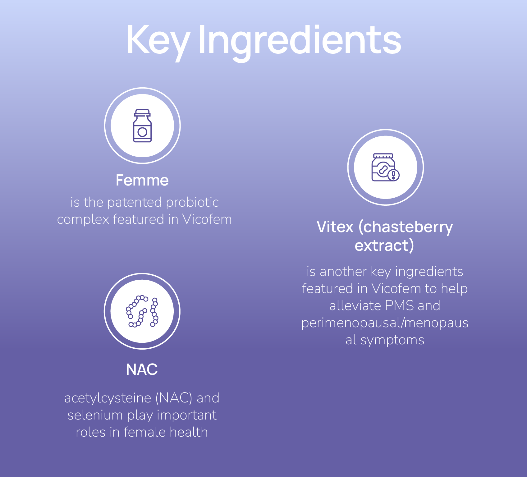 Vicofem® is specially designed to support women’s health throughout all life stages by reducing inflammation and promoting a healthy vagina microbiota. It is clinically proven to: