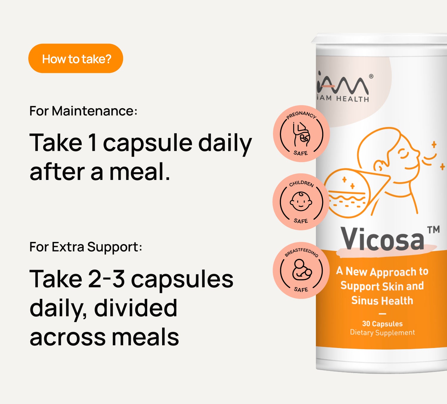 Vicosa® is specially formulated with research-backed probiotic strains, essential nutrients, and prebiotic fiber to help manage symptoms of skin and sinus related conditions such as sinus congestion and eczema. As a daily probiotic supplement, Vicosa® is the perfect choice to restore balance from within, at the microbiome level.